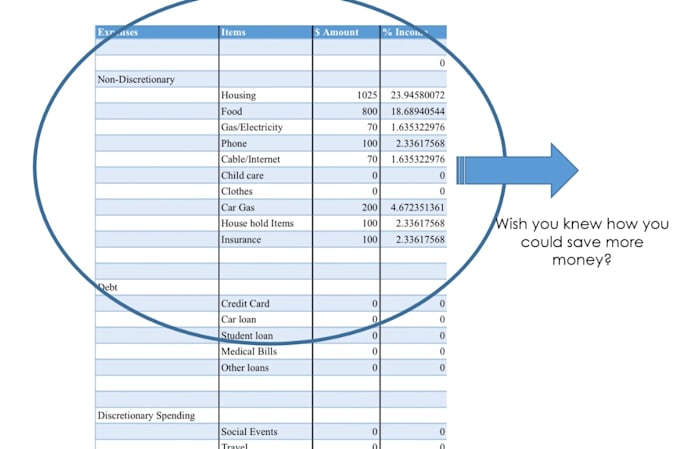 Are you not saving enough money? Do you feel like your paychecks never sit in your accounts for more than a week?I can create a "budget" spreadsheet tailored around your specific lifestyle. This spreadsheet will allow you to see exactly what percentage of your money is going where and how much you could potentially save each month. For more advanced services, we offer the ability to create a target savings based on your age and spending habits.
