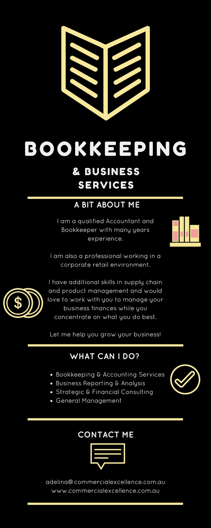 I have additional skills in supply chain and product management and would love to work with you to manage your business finances while you concentrate on what you do best.